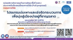 กรอบการวิจัย “โปรแกรมบ่มเพาะและเร่งรัดกระบวนการเพื่อมุ่งสู่เมืองน่าอยู่ที่ชาญฉลาด” ประจำปีงบประมาณ 2569 สามารถส่งข้อเสนอโครงการวิจัยฉบับสมบูรณ์ ได้ตั้งแต่วันที่ 19 มกราคม 2569 –