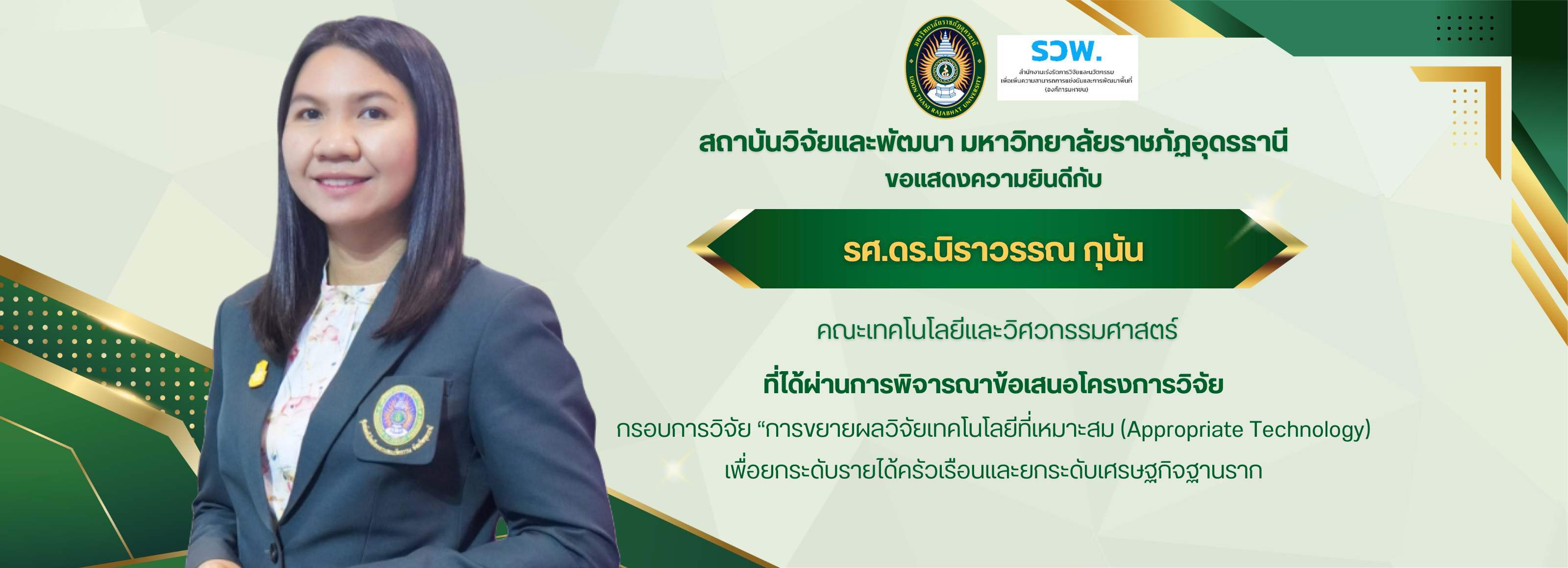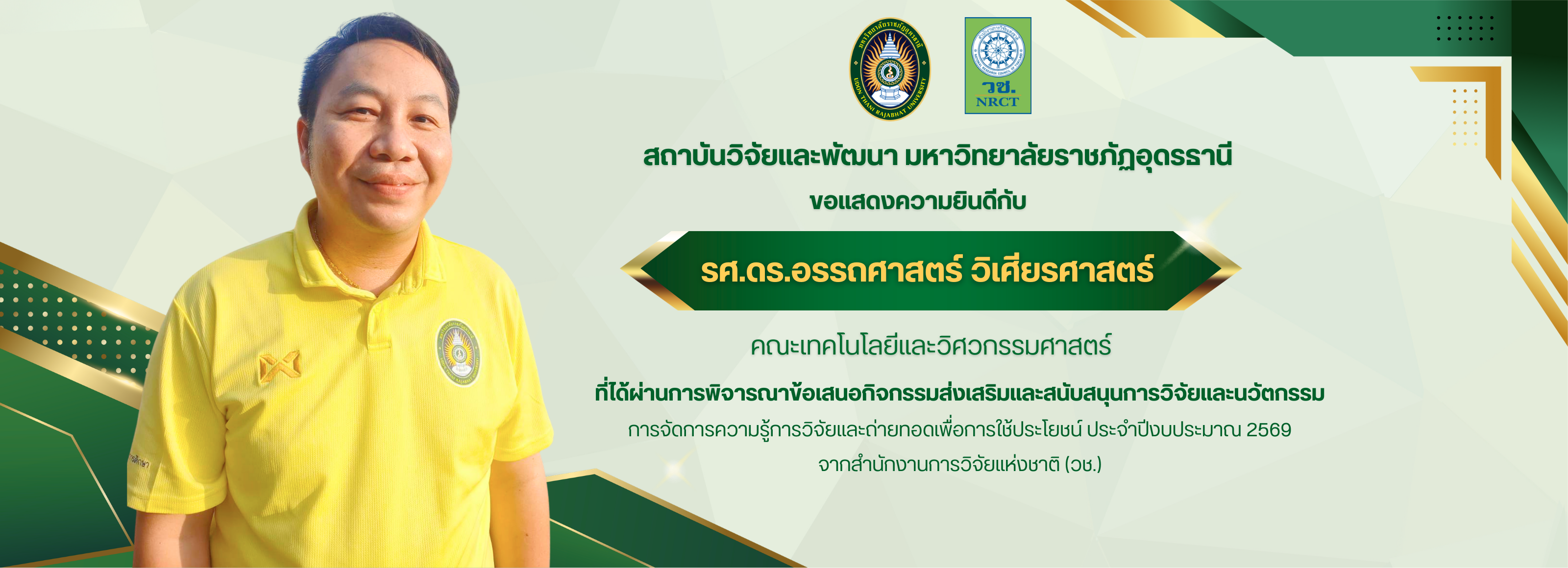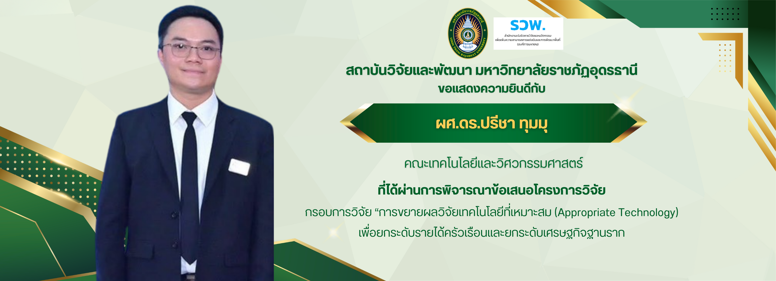 - สถาบันวิจัยและพัฒนา มหาวิทยาลัยราชภัฏอุดรธานี ขอเชิญอาจารย์ บุคลากรที่สนใจ เข้าร่วมการอบรมหัวข้อ “การเตรียมผลงานรับใช้ท้องถิ่นและสังคม ให้สอดคล้องกับเกณฑ์การขอตำแหน่งทางวิชาการ”ประจำปีงบประมาณ 2569