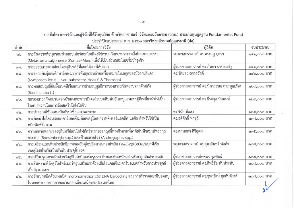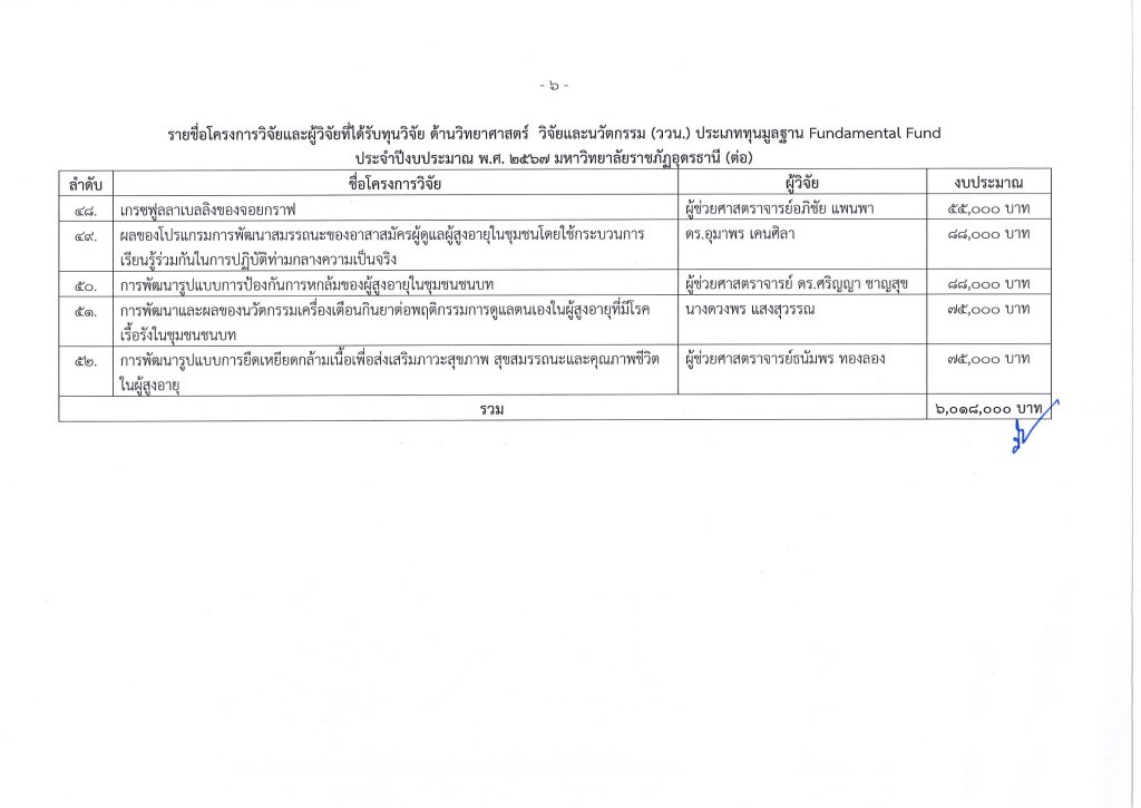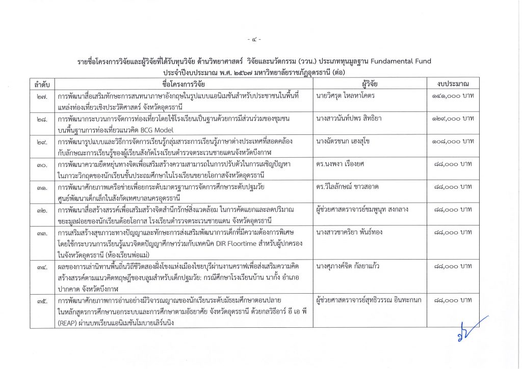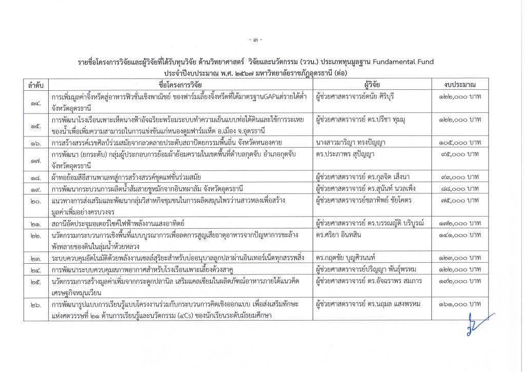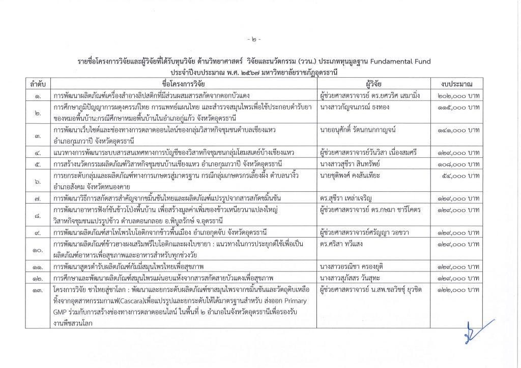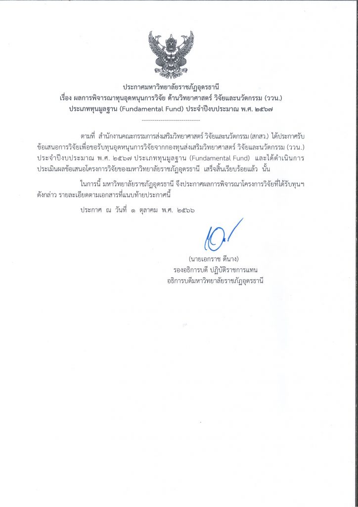 ประกาศมหาวิทยาลัยราชภัฏอุดรธานี เรื่อง ผลการพิจารณาทุนอุดหนุนการวิจัย ด้านวิทยาศาสตร์ วิจัยและนวัตกรรม (ววน.)
