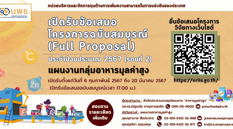 บพข. รับข้อเสนอโครงการ (Full Proposal) แผนงานกลุ่มอาหารมูลค่าสูง รอบที่ 2