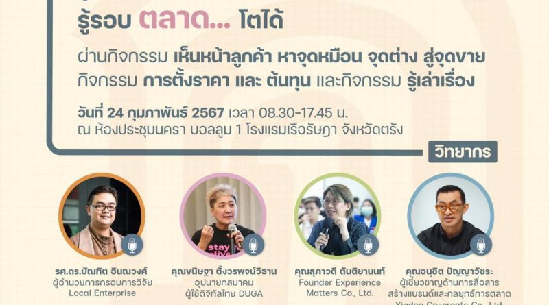 ผ่านกิจกรรม “เห็นหน้าลูกค้า หาจุดเหมือน จุดต่าง สู่จุดขาย” กิจกรรม “การตั้งราคา และ ต้นทุน” และกิจกรรม “รู้เล่าเรื่อง” ในวันเสาร์ที่ 24 ก.พ. 2567 เวลา 08.30-17.45 ณ ห้องประชุมนครา บอลรูม 1 โรงแรมเรือรัษฎา จังหวัดตรัง โดยผู้สนใจสามารถลงทะเบียนได้ที่ คลิก หรือแสกนผ่าน qr code ติดต่อสอบถาม คุณนารีนาถ พวงจีน โทร.0959629189 ปิดรับลงทะเบียนวันที่ 18 กุมภาพันธ์ 2567 จัดโดย สถาบันเกื้อกูลเศรษฐกิจชุมชน