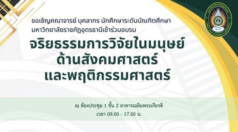 ลงทะเบียนเข้าร่วมอบรมจริยธรรมการวิจัยในมนุษย์ “ด้านสังคมศาสตร์และพฤติกรรมศาสตร์” ในวันเสาร์ที่ 28 กันยายน 2567 เวลา 09.00 – 17.00 น. ณ ห้องประชุม 1 ชั้น 2 อาคารเฉลิมพระเกียรติฯ มหาวิทยาลัยราชภัฏอุดรธานี
