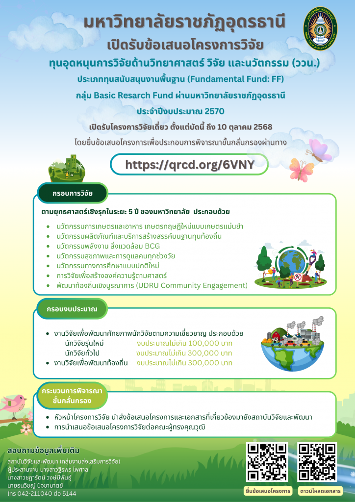 มหาวิทยาลัยราชภัฏอุดรธานี เปิดรับข้อเสนอโครงการวิจัย “ทุนอุดหนุนการวิจัย ด้านวิทยาศาสต์ วิจัยและนวัตกรรม (ววน.) ประเภททุนสนับสนุนงานมูลฐาน (Fundamental Fund) กลุ่ม Basic Research Fund ประจำปีงบประมาณ พ.ศ. 2570”