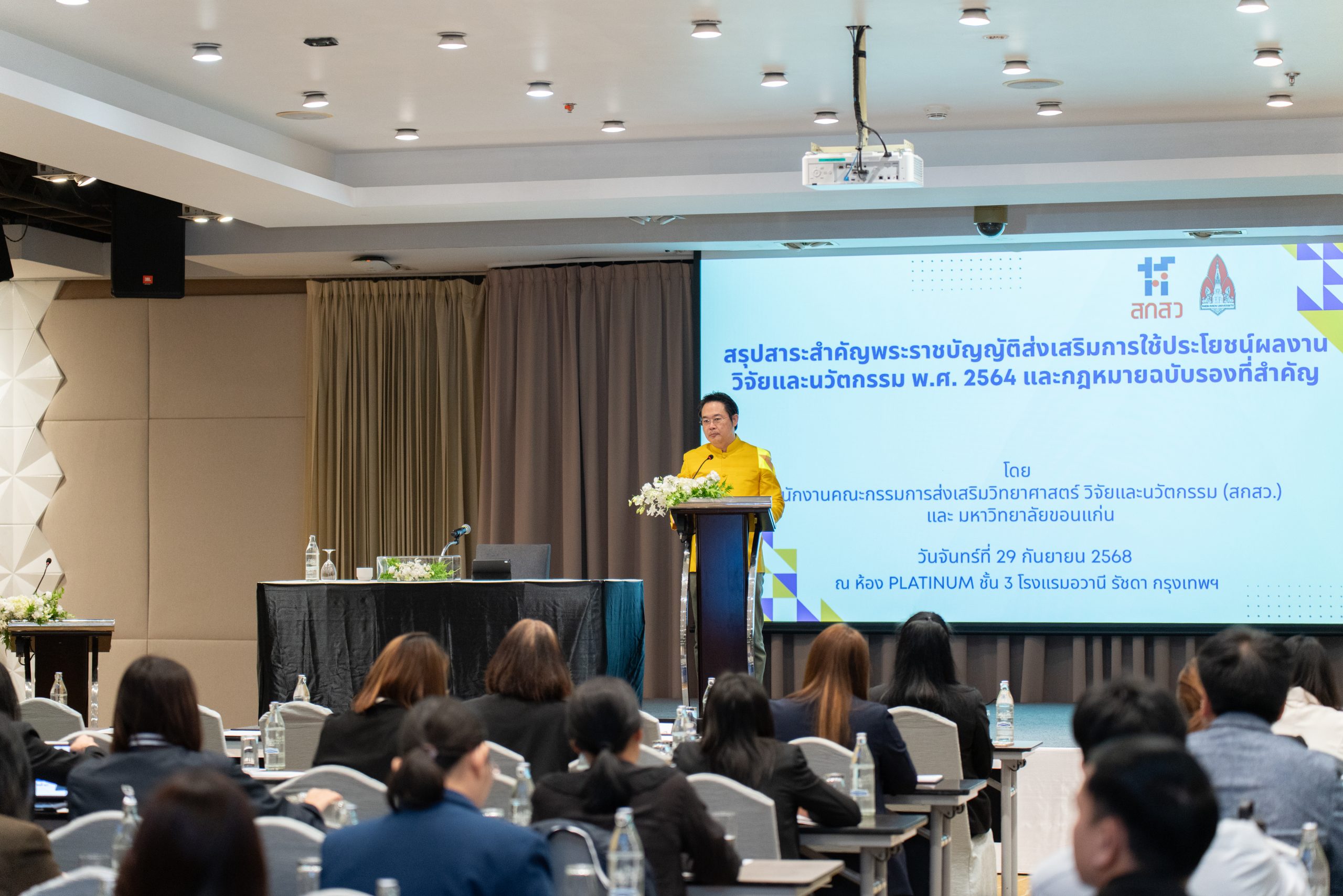 วันที่ 29 – 30 กันยายน 2568 ณ โรงแรมอวานี รัชดา กรุงเทพฯ นายอภิเดช อภิพัฒน์ภาดุล นักวิชาการศึกษา เข้าร่วมการอบรมสรุปสาระสำคัญพระราชบัญญัติส่งเสริมการใช้ประโยชน์ผลงานวิจัยและนวัตกรรม พ.ศ. 2564 และกฎหมายฉบับรองที่สำคัญ และการใช้งานระบบเทคโนโลยีสารสนเทศที่รองรับพระราชบัญญัติส่งเสริมการใช้ประโยชน์ผลงานวิจัยและนวัตกรรม พ.ศ. 2564 จัดโดยสำนักงานคณะกรรมการส่งเสริมวิทยาศาสตร์ วิจัยและนวัตกรรม (สกสว.) และมหาวิทยาลัยขอนแก่น เพื่อสร้างการรับรู้และความตระหนักในการปฏิบัติการพระราชบัญญัติส่งเสริมการใช้ประโยชน์ผลงานวิจัยและนวัตกรรม พ.ศ. 2564 และกฎหมายรับรองที่เกี่ยวข้อง ตลอดจนระบบสารสนเทศรองรับการดำเนินการตามพระราชบัญญัติส่งเสริมการใช้ประโยชน์ผลงานวิจัยและนวัตกรรม พ.ศ. 2564 เป็นการวางรากฐานสำคัญในการพัฒนานวัตกรรม และสร้างมูลค่าเพิ่มอย่างยั่งยืนให้แก่ประเทศต่อไป