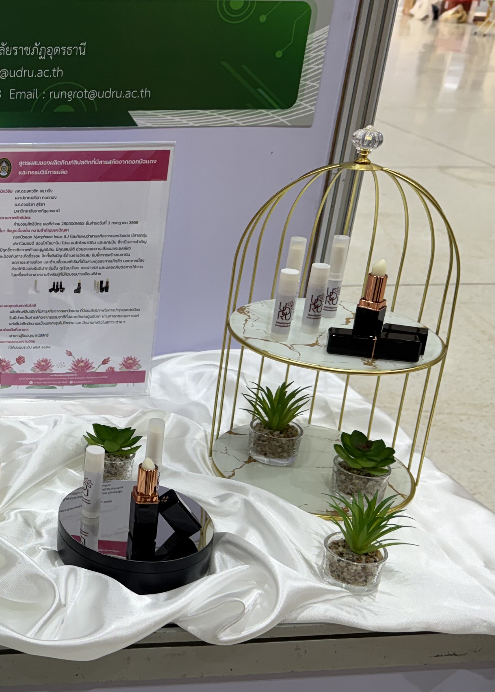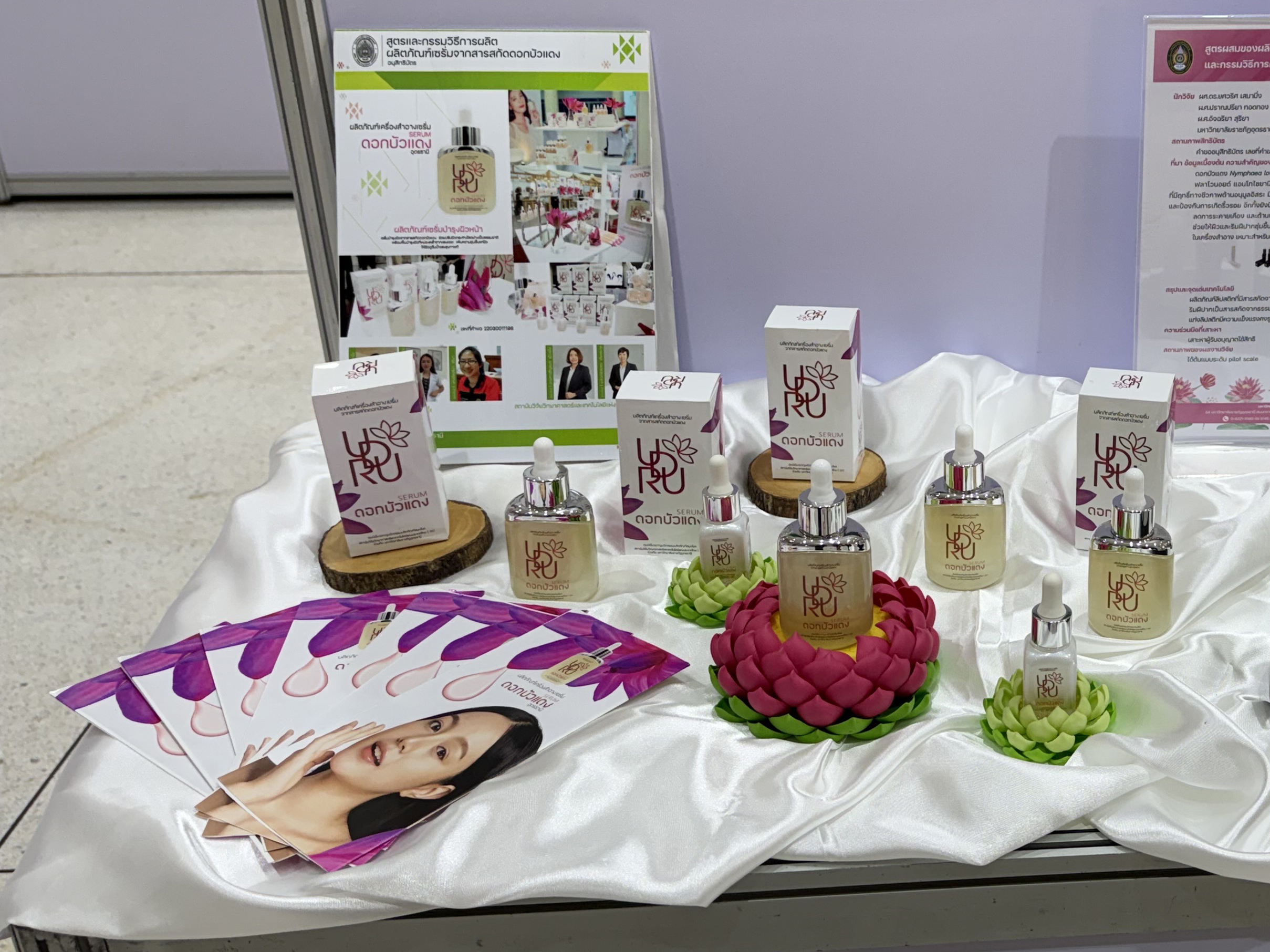 2. การจัดแสดงผลิตภัณฑ์ชุมชนและทรัพย์สินทางปัญญา ซึ่งมหาวิทยาลัยได้ร่วมจัดแสดงผลิตภัณฑ์จากสารสกัดดอกบัวแดง ได้แก่ ผลิตภัณฑ์เซรั่มจากสารสกัดดอกบัวแดง และลิปสติกที่มีสารสกัดจากดอกบัวแดง