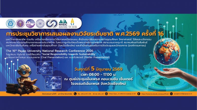 มหาวิทยาลัยพายัพ ร่วมกับ เครือข่ายบริหารการวิจัยภาคเหนือตอนบน สำนักงานปลัดกระทรวงการอุดมศึกษา วิทยาศาสตร์ วิจัยและนวัตกรรม สมาคมสถาบันอุดมศึกษาเอกชนแห่งประเทศไทย ในพระราชูปถัมภ์ สมเด็จพระเทพรัตนราชสุดาฯ สยามบรมราชกุมารี สมาคมพันธกิจสัมพันธ์ มหาวิทยาลัยกับสังคม และเครือข่ายสถาบันอุดมศึกษา จังหวัดเชียงใหม่ และสำนักงานส่งเสริมการจัดประชุมและนิทรรศการ (องค์การมหาชน) ขอประชาสัมพันธ์เรียนเชิญคณาจารย์ นักวิจัย นิสิต/นักศึกษา และบุคลากรที่สนใจ เข้าร่วมการประชุมวิชาการเสนอผลงานวิจัยระดับชาติ พ.ศ. 2569 ครั้งที่ 16 (The 16th Payap University National Research Conference 2026) ภายใต้แนวคิด “Social Responsibility towards Sustainability” เพื่อเป็นเวทีในการและเปลี่ยนความรู้และประสบการณ์ นำเสนอผลงานวิจัยและเผยแพร่ผลงานวิชาการสู่สาธารณะชน