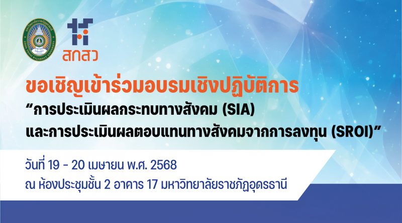 Read Moreสถาบันวิจัยและพัฒนาขอเชิญอาจารย์ นักวิจัยและบุคลากร มหาวิทยาลัยราชภัฏอุดรธานี เข้าร่วม อบรมเชิงปฏิบัติการ “การประเมินผลกระทบทางสังคม (SIA) และการประเมินผลตอบแทนทางสังคมจากการลงทุน (SROI)” วันที่ 19 – 20 เมษายน 2568ณ ห้องประชุม ชั้น 2 อาคาร 17
