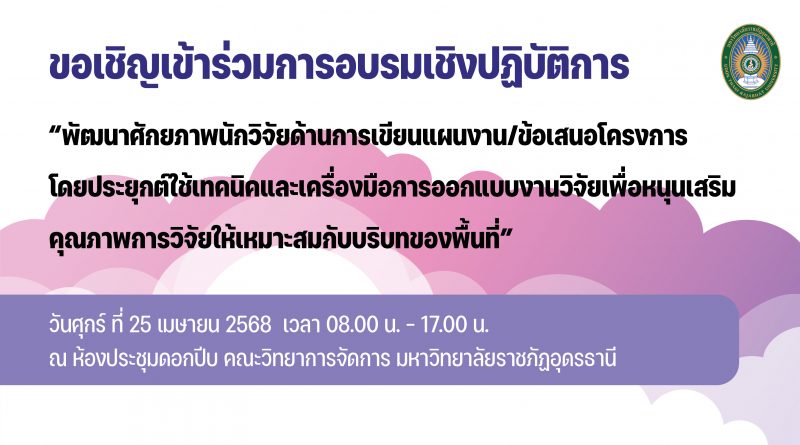 Read Moreสถาบันวิจัยและพัฒนาขอเชิญเข้าร่วมโครงการอบรมเชิงปฏิบัติการ “พัฒนาศักยภาพนักวิจัยด้านการเขียนแผนงาน/ข้อเสนอโครงการ โดยประยุกต์ใช้เทคนิคและเครื่องมือการออกแบบงานวิจัยเพื่อหนุนเสริมคุณภาพการวิจัยให้เหมาะสมกับบริบทของพื้นที่” วันที่ 25 เมษายน 2568 เวลา 08.00 – 17.00 น.ณ ห้องประชุมดอกปีบ คณะวิทยาการจัดการ มหาวิทยาลัยราชภัฏอุดรธานี สามารถลงทะเบียนผ่านลิงก์ได้ที่ :https://udru.link/NQap สอบถามเพิ่มเติมได้ที่กลุ่มงานส่งเสริมการวิจัยฯ สถาบันวิจัยและพัฒนาโทร. 042-211040